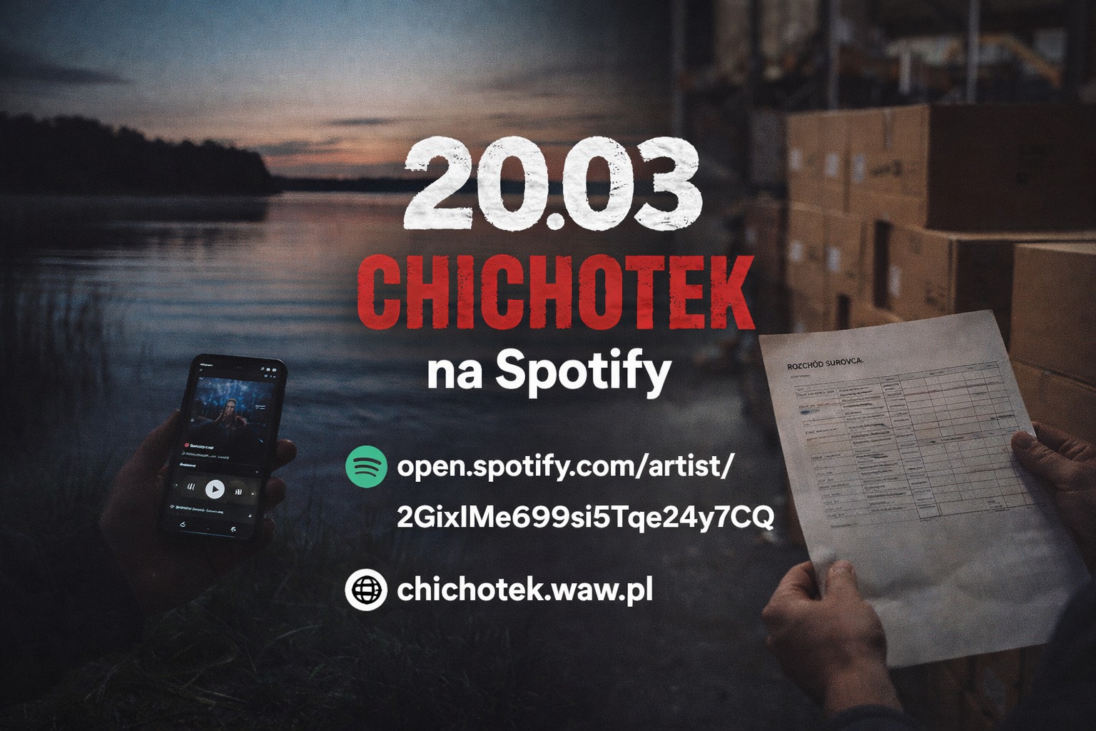 20.03 – zapamiętaj tę datę. Wczoraj **Chichotek wjechał na Spotify**. Bez wytwórni. Bez pchania na siłę. Między pracą, magazynem i trasami. To nie jest „kolejny numer do playlisty”. To są historie z życia, które wielu zna, tylko mało kto mówi o nich głośno. Sprawdź i oceń sam.